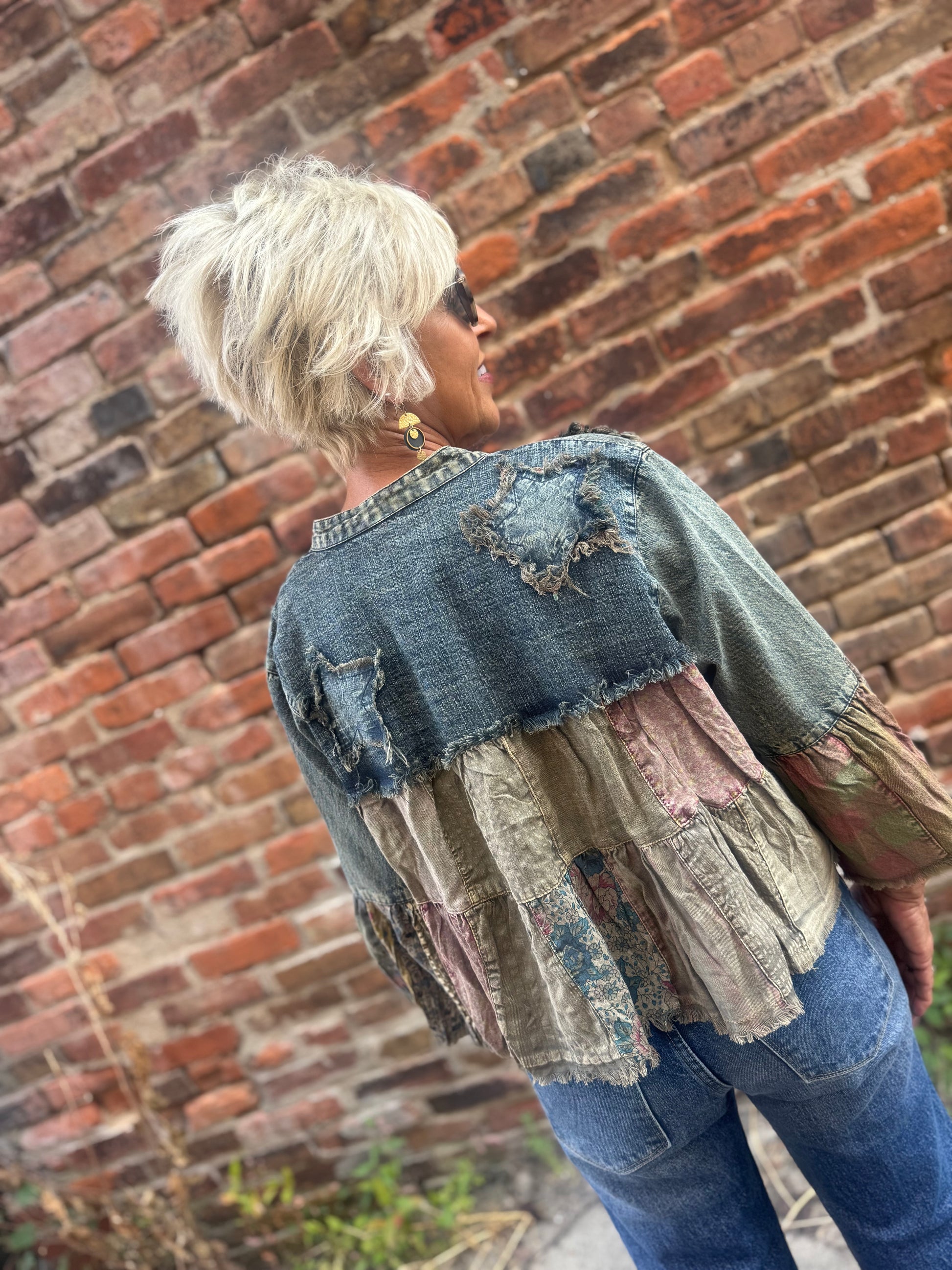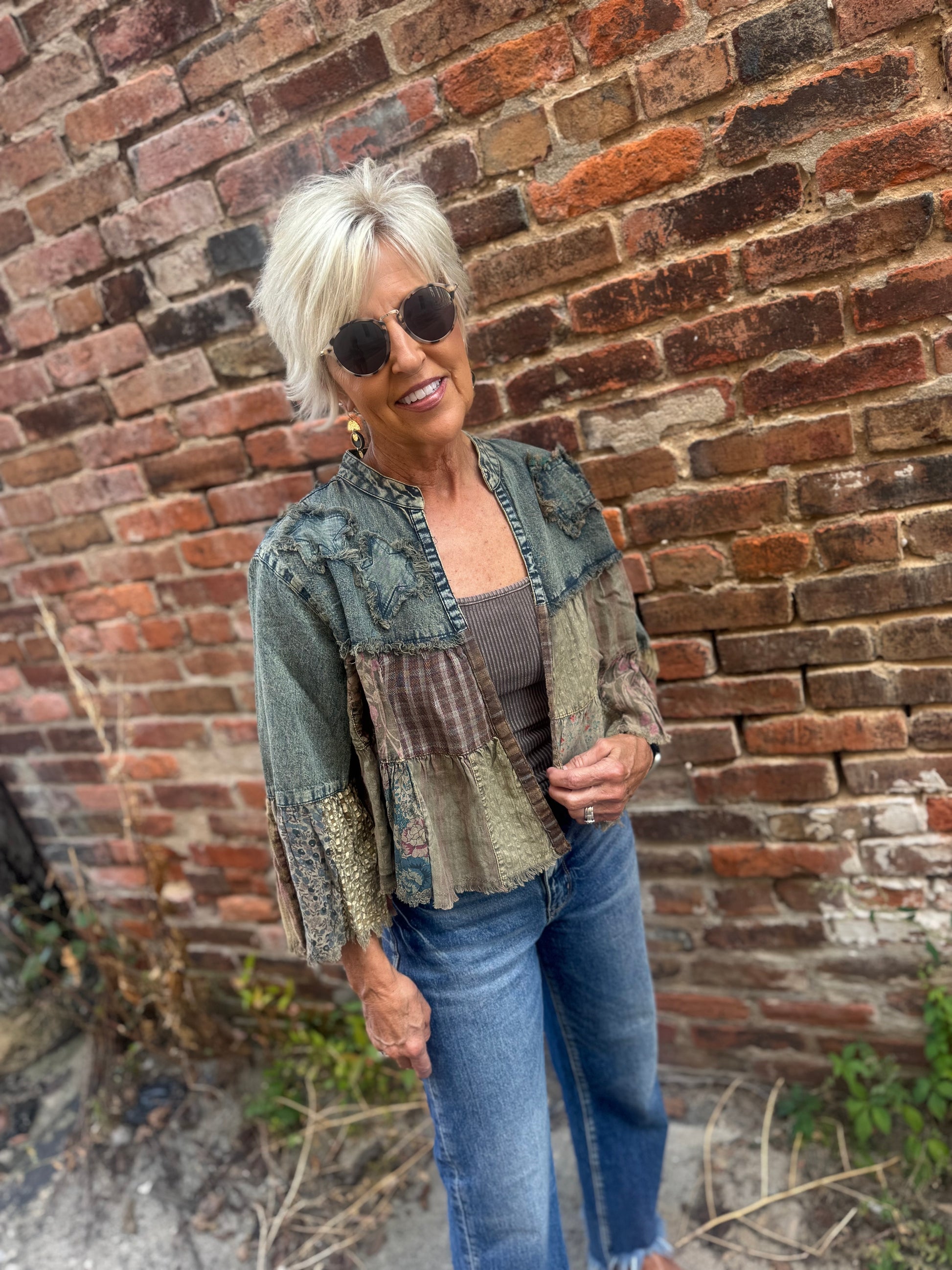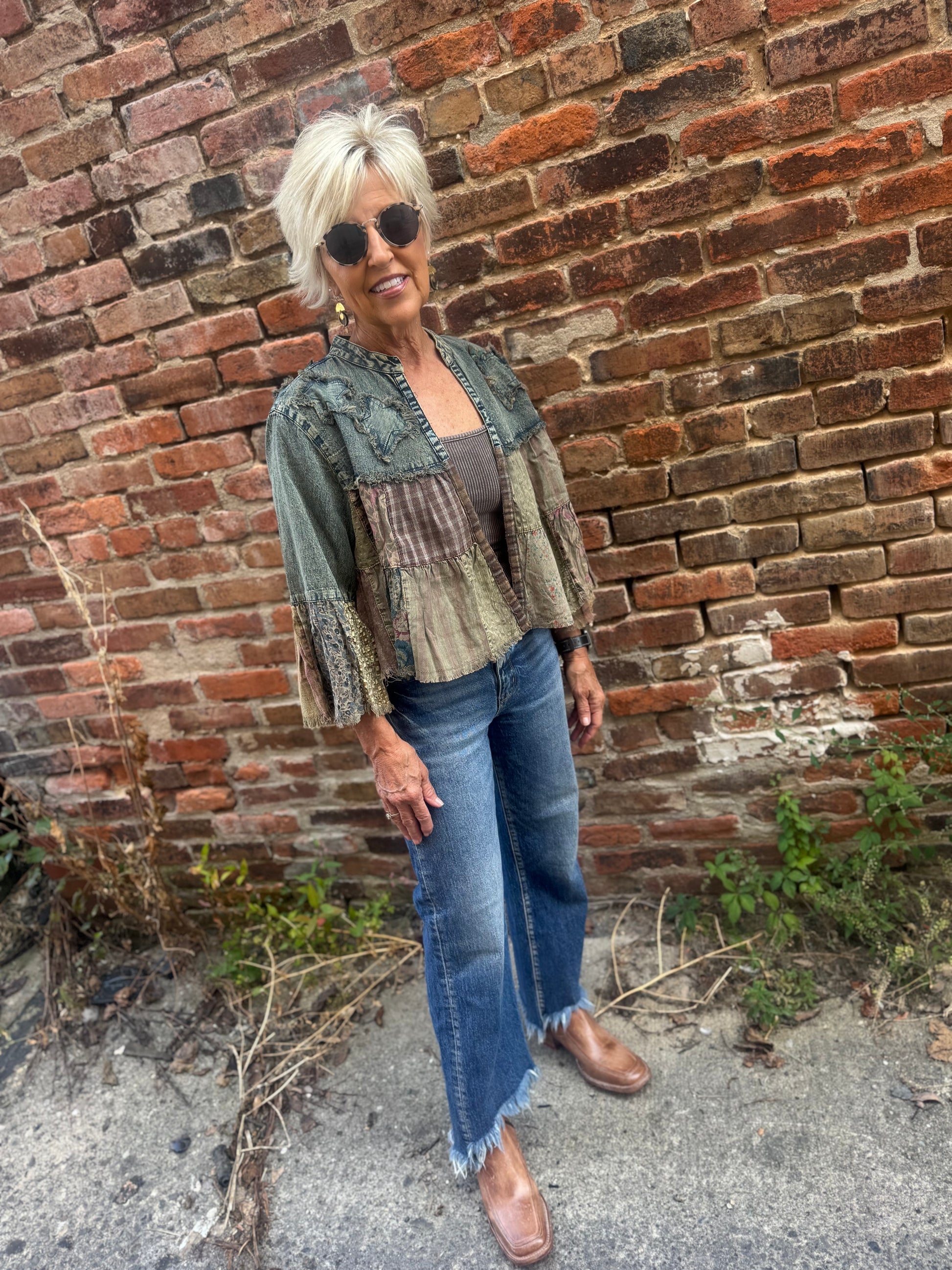 all the rustic boho vibes, cropped kimino, plaid and denim. fits true to size