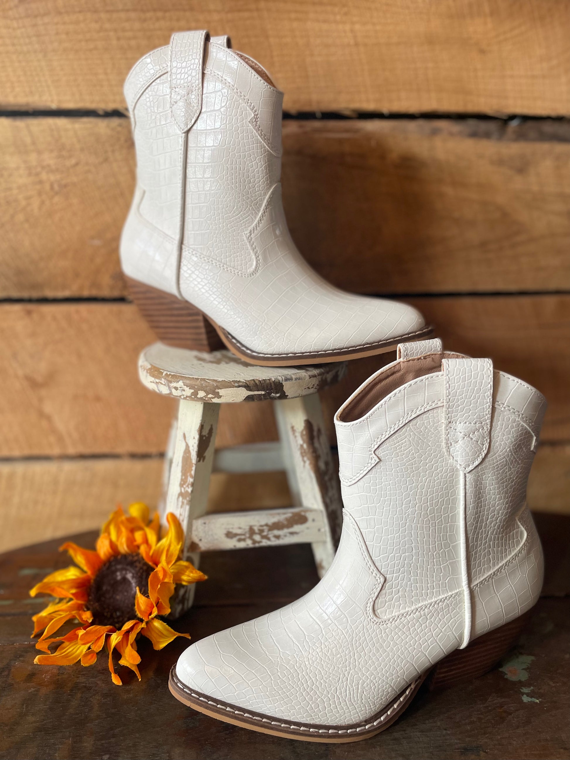 Short fashion cowgirl boots with pull up straps on either side, curved stacked leather heel and an almond shaped-toe.