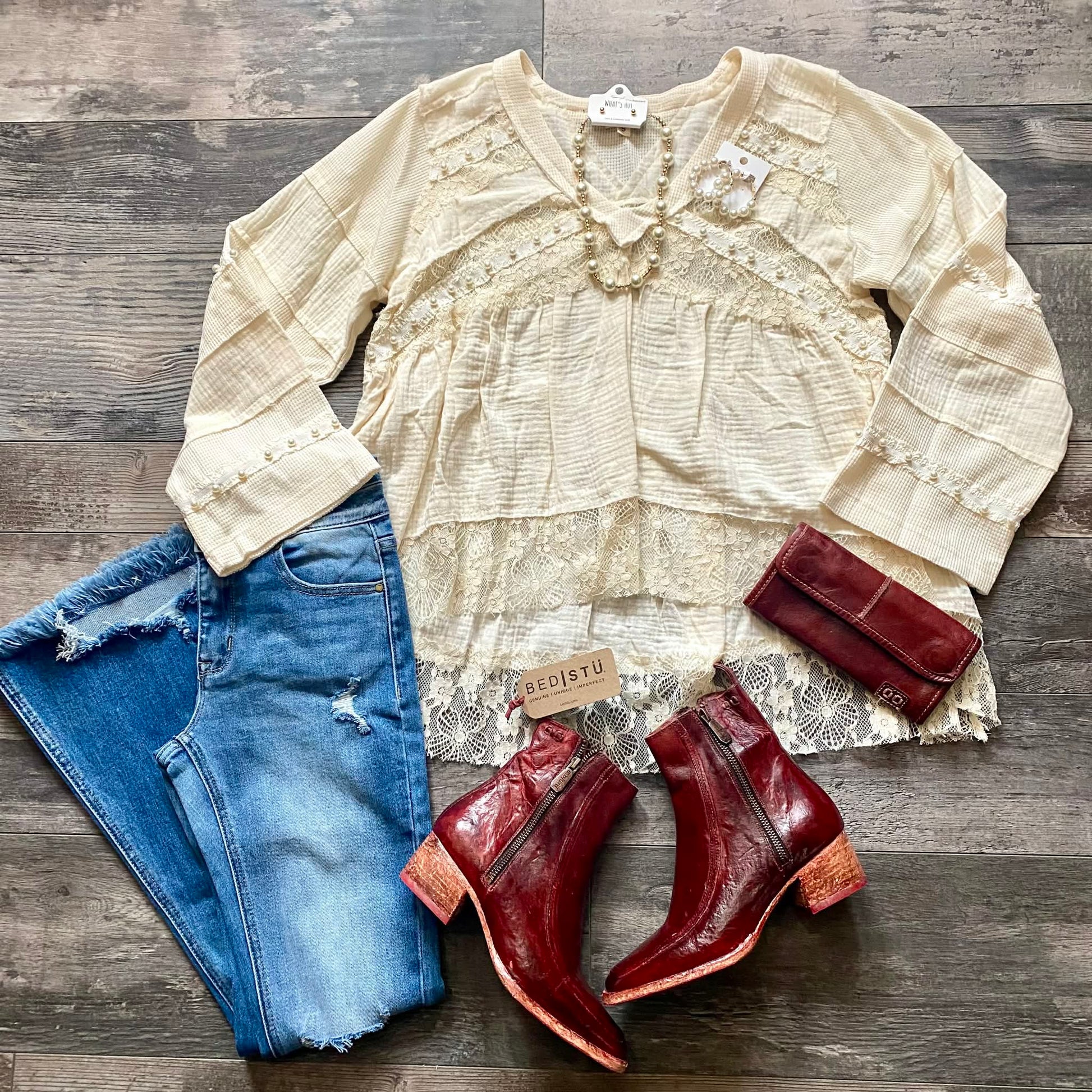 flowy and so unique top, cream lace with cute pearl detail, by POL