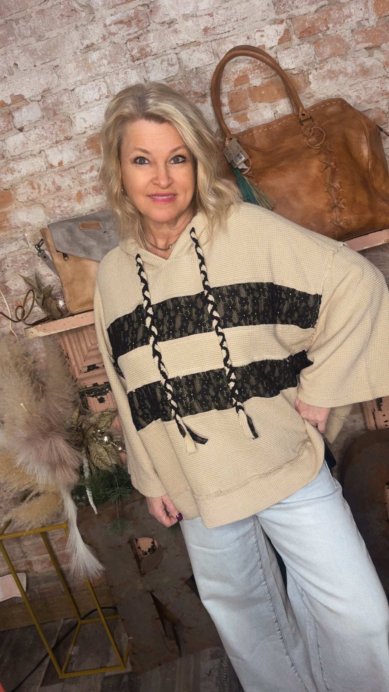 oversized comfy, tan top, with black lace detail on front, and cute rope detail, cropped sleeve, trendy & fun by POL