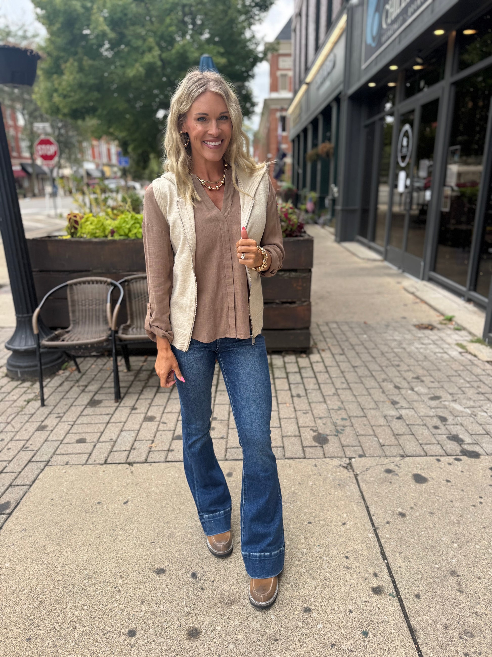 oatmeal elan zip up vest, great for layering, causal or dressy